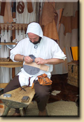 Le cuir, matériau de première nécessité au Moyen Age, est une matière vivante qu'il faut traiter avec soin. Les cuirs, selon l'origine et les traitements effectués, sont fort différents aussi bien dans leur qualité, leur aspect ou texture que dans leur usage. Pour une semelle de chaussure, une peau de bœuf sera préférable à une peau d'agneau dont la souplesse sera appréciée dans un vêtement. Le choix du cuir par le bourrelier, se fait en fonction du travail à effectuer et des exigences de ses commanditaires. Les outils utilisés pour travailler le cuir sont le compas à pointe sèche, les alênes, le fil de lin ou de chanvre poissés, les aiguilles et le couteau demi-lune emblème de la corporation des bourreliers. En plus de travailler le cuir, le bourrelier était parfois musiciens ou conteur à ses heures. |
