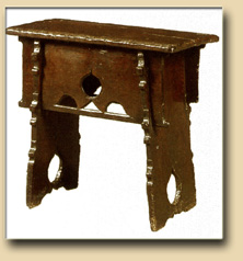Sur le continent, aucune escabelle des XV° et XVI° siècles n'est parvenue jusqu'à nous, en revanche l'Angleterre a conservé bon nombre d'exemplaires de ce type de siège. On en trouve dans les églises, les collèges, les manoirs... |